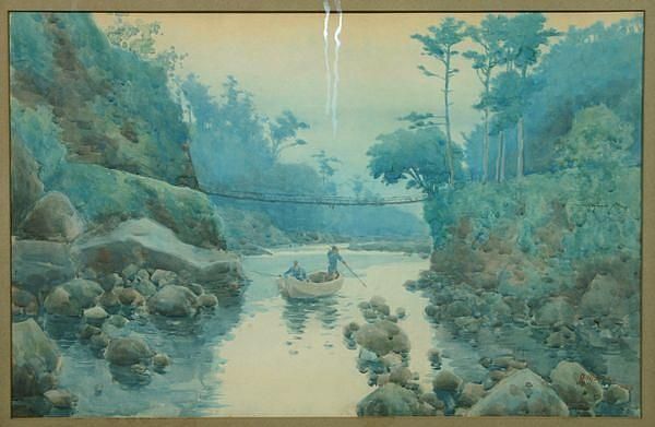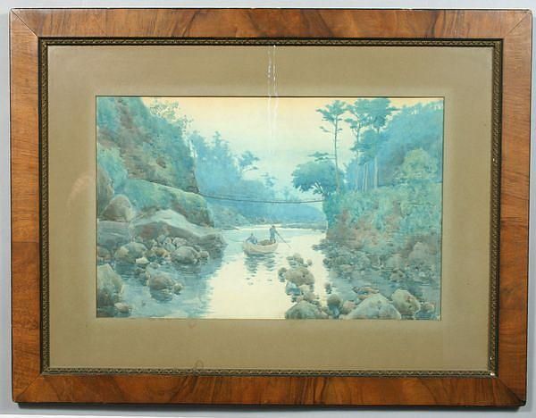 River landscape with two men in boat