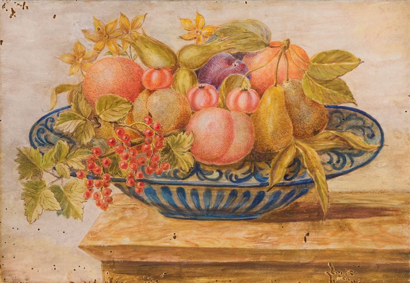 FRUITS AND FLOWERS INA CERAMIC DISH
