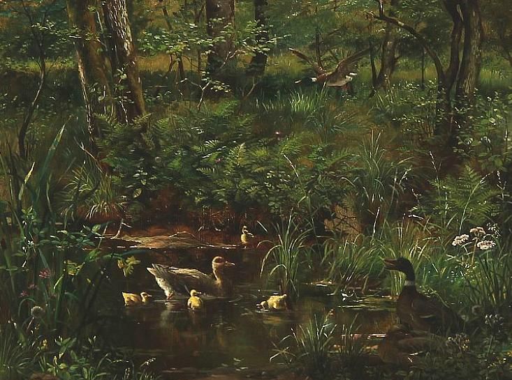 Forest lake with ducks.