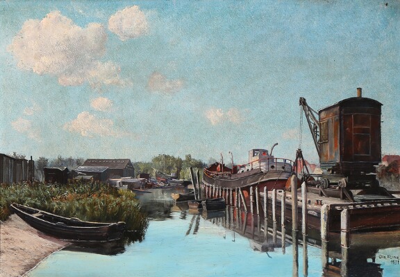 A crane and ships in Køge harbour.