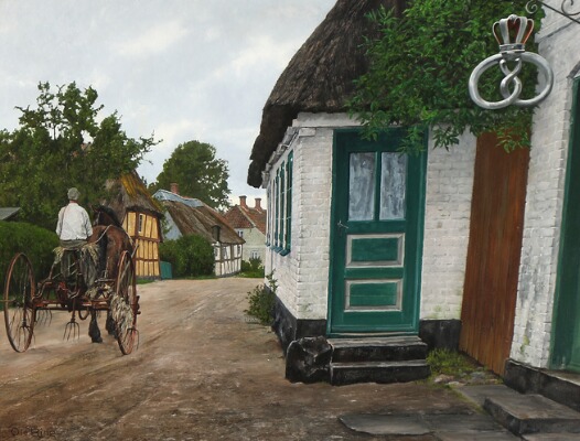 | Village scene with a farmer, passing by the local bakery on his harvester. | |