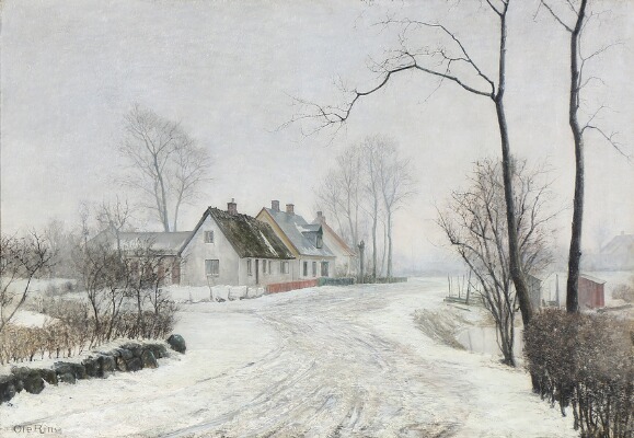 | Winter scenery with a snow-covered road, winding through a village | |