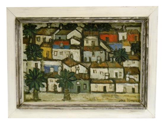 | depicting four rows of houses with scattered palm trees, signed LR, in white painted frame with gray trim | |