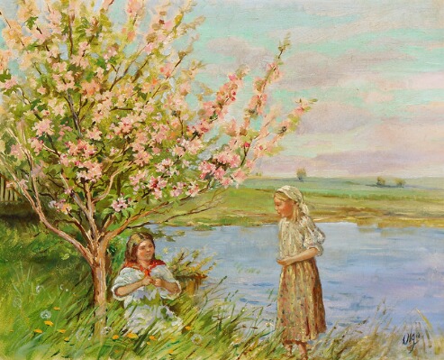 Summer scene with boy and girl beneath a Cherry Blossom tree