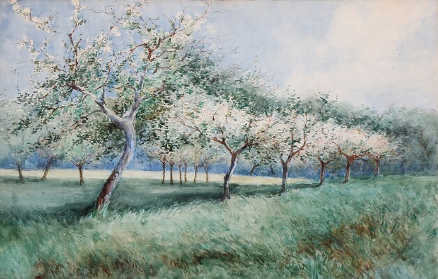 Spring landscape with blossum fruit trees