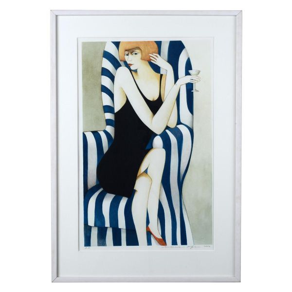Kvinna med drink i randig fåtölj