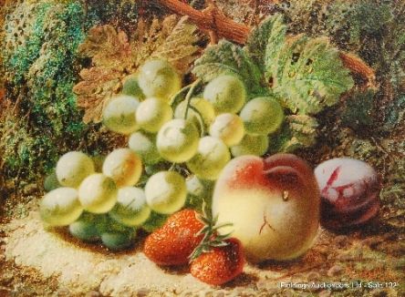 apples, gooseberries, black grapes, strawberries, a peach and a plum on a mossy bank, a pair
