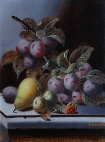 Black grapes, plums, peaches, gooseberries and raspberries on a ledge
