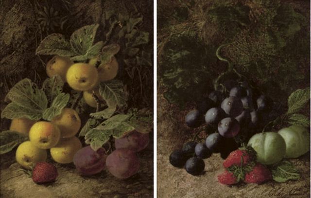 Plums and a strawberry; and Grapes, green plums and strawberries