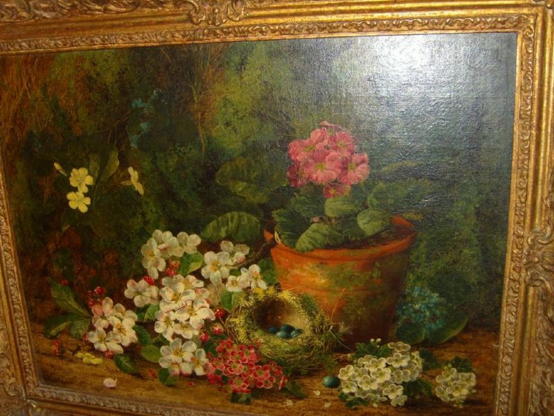 | showing a still life with geranium in terracotta pot, birds nest, primroses, fallen blossom | |
