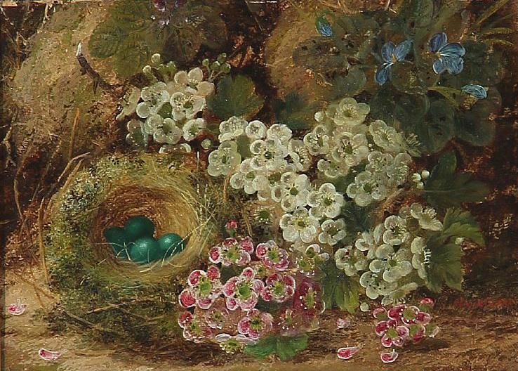 Still life with flowers and eggs in a nest.
