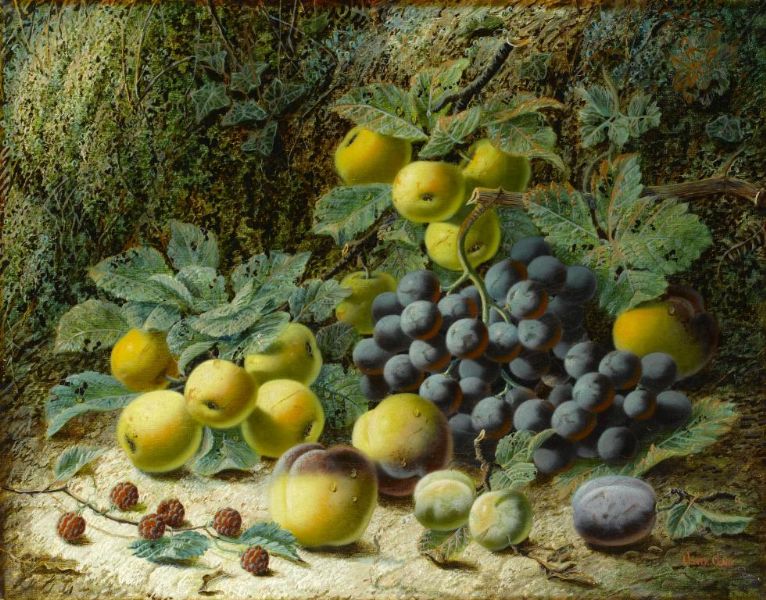 | STILL LIFE WITH QUINCES APPLES GRAPES GREENGAGES RASPBERRIES AND A PLUM ON A MOSSY BANK WITH IVY | |
