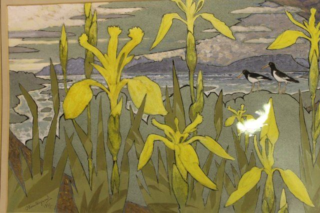 Gulls perched on rocks behind yellow flowers