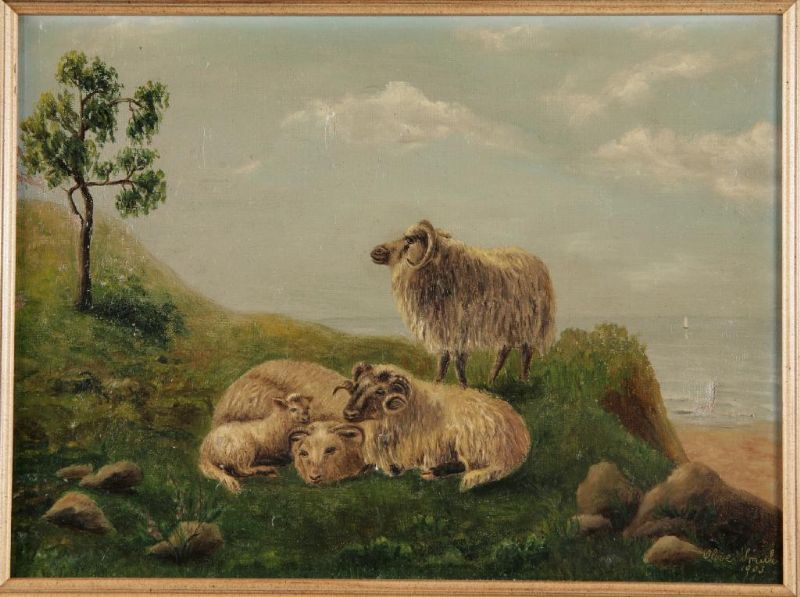 SHEEP ON A GRASSY CLIFF with a sandy bay below