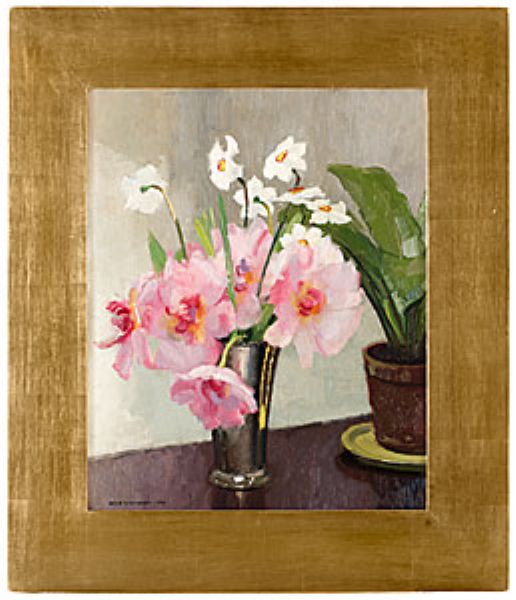 STILLEBEN MED PIONER OCH PINGSTLILJOR.