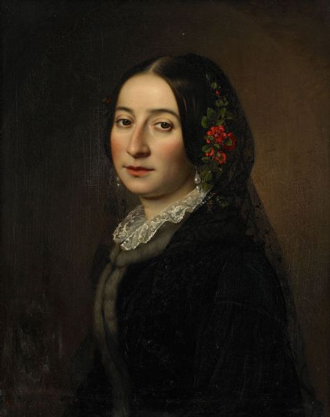 Italienska i pälsbrämad dräkt, bärandes svart mantilla - midjebild