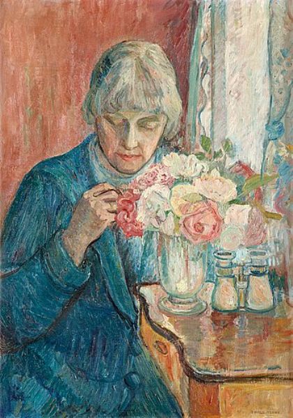 | Kris syr (Dam vid rosbukett ) (Kris sewing / Lady by a bouquet of roses). | |