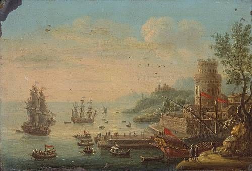 A Mediterranean harbor scene with numerous ships and figures in the foreground