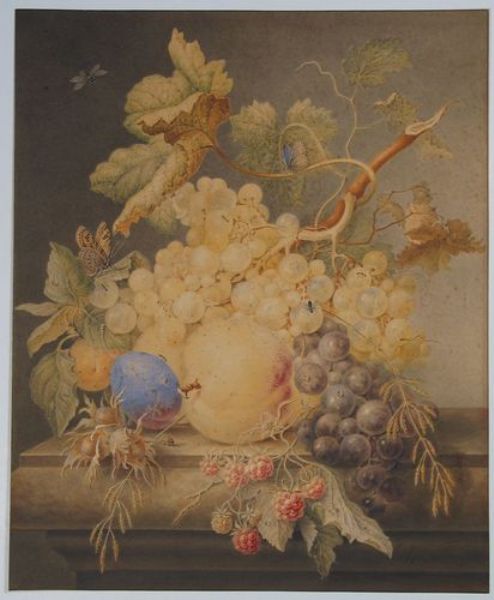 | Still life with grapes, a peach, a prune, raspberries and insects | |