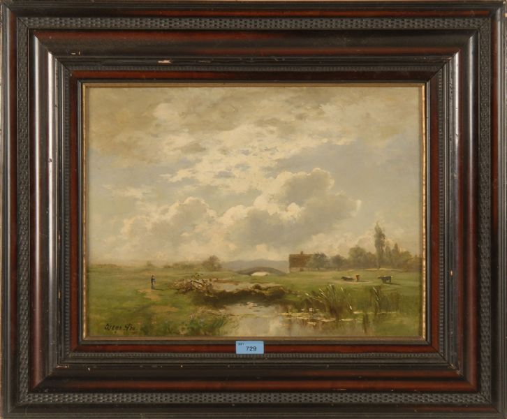 Pastoral landscape with cows.