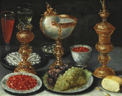 | A lavish still life with fruits on plates, gilt goblet, nautilus cup and a glass of wine. | |