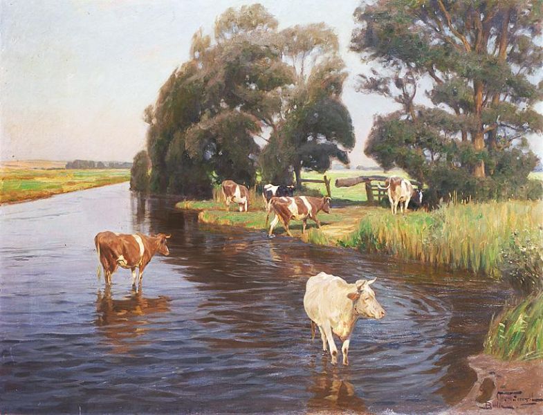 Kühe am Wasser in weiter Sommerlandschaft