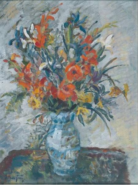 Bunter Blütenstrauß im Henkelkrug, sonnig beleuchtet.