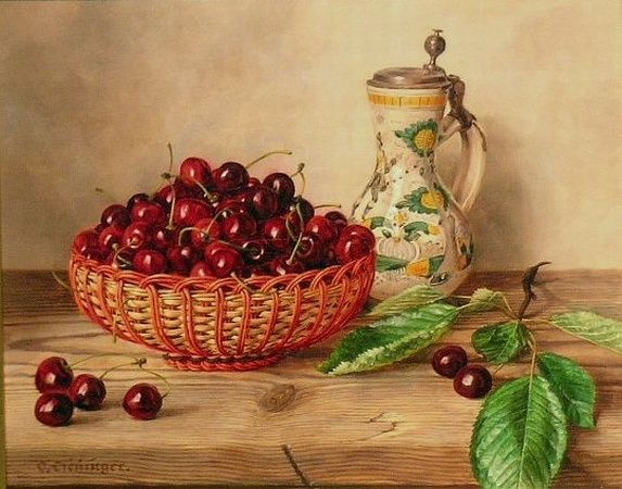 STILL LIFE WITH CHERRIES AND TANKARD ON A WOOD LEDGE