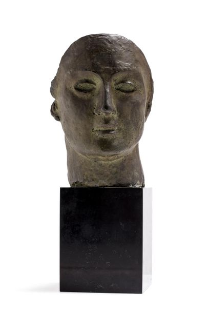 | Bronze à patine verte à l'antique figurant le visage d'une femme. Socle en marbre noir. | |