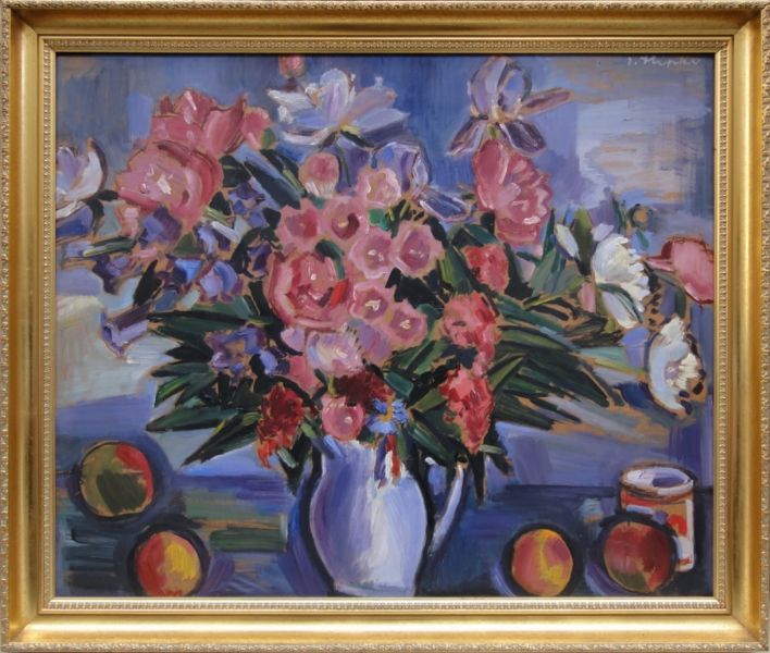 Zátiší s velkou kyticí v bílém džbánu a ovocem