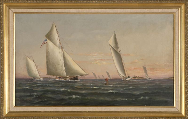 Numerous catboats racing around a buoy under sunset skies.