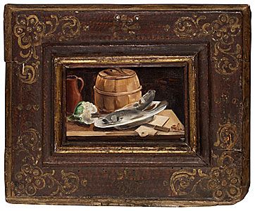 NATURE MORTE MED BLOMKÅLSHUVUD OCH FISKAR.
