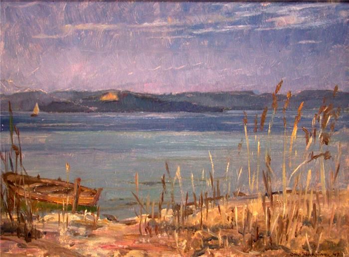 Sommerliche Uferpartie mit Ruderboot am Schilf