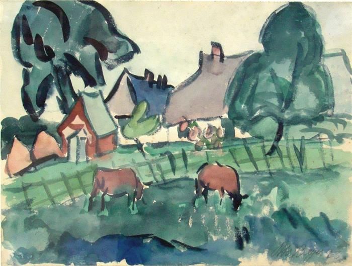 Expressive Dorfansicht mit Rindern