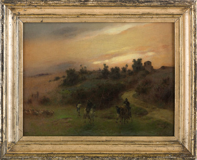 Morgengrauen in der Campagna. In Senke Hirten zu Pferd und Schafe