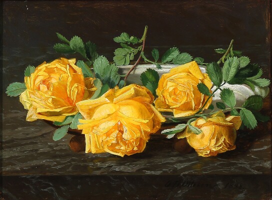 A dish of yellow roses on a stone sill