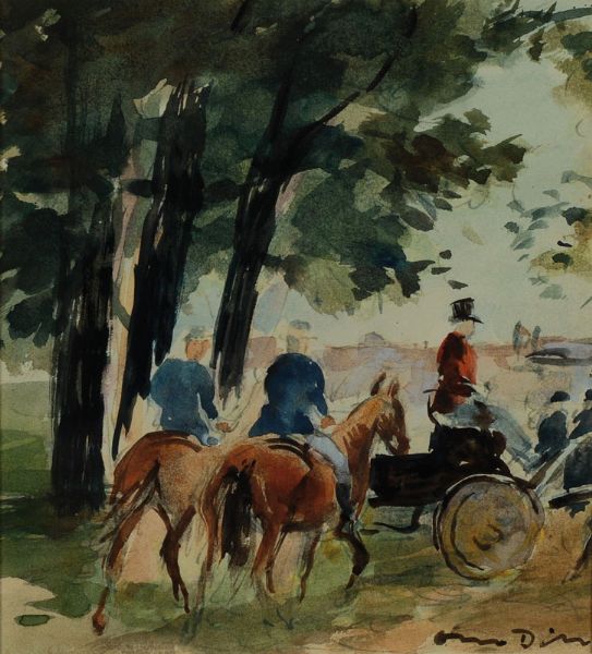 Kutsche und zwei Reiter im Park