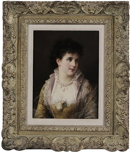 Portrait of a Young Beauty in Pearls and Lace, satin gown