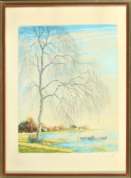 Birke am Seeufer mit Ruderbooten