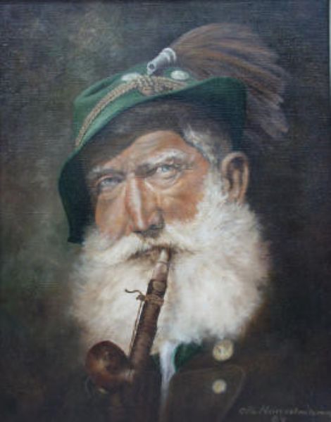 Portrait eines bärtigen Bayern mit Hut und Pfeife
