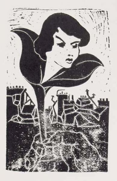Linolplatte, Hand eine Blume haltend, diese mit Frauenkopf als Blüte