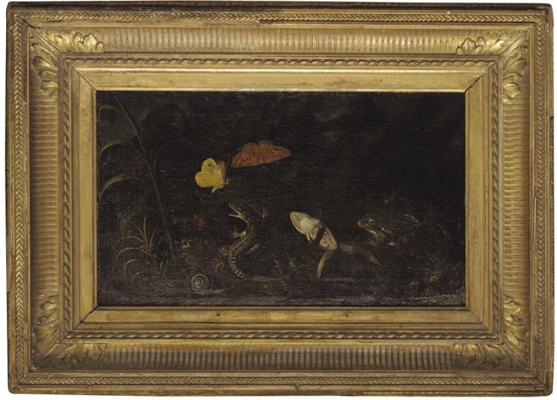 | A FOREST FLOOR WITH FROGS, A LIZARD, A SNAIL AND BUTTERFLIES | |