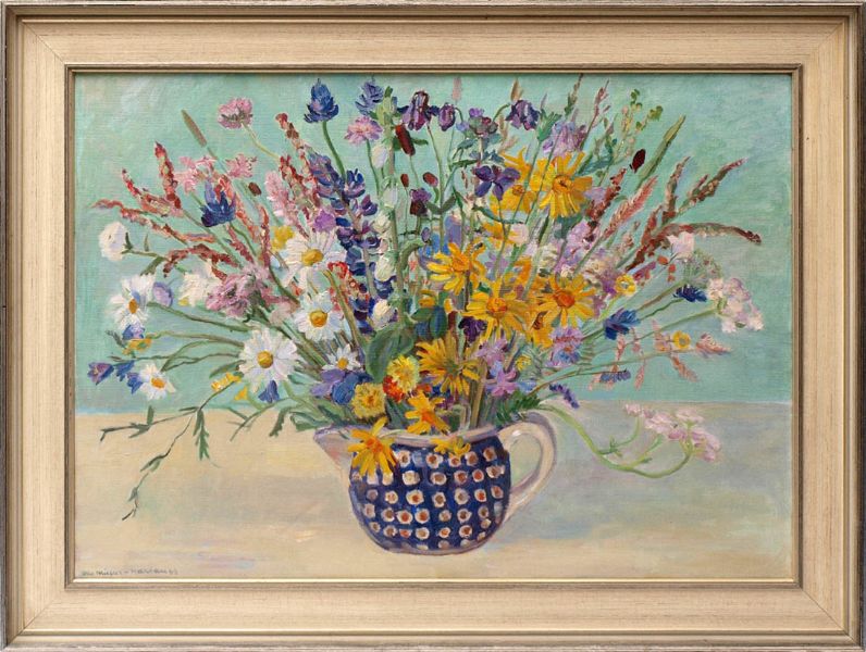 Sommerblumenstrauß in Bunzlauer Keramikkrug vor changierendem Hintergrund.