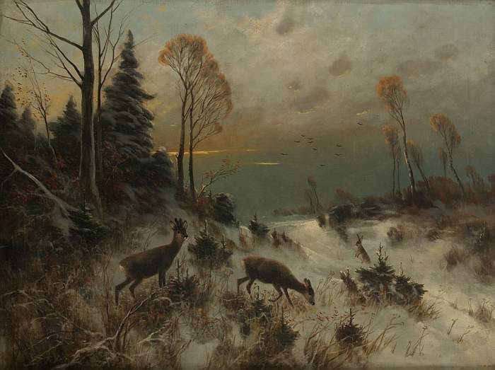 Winterlandschaft mit Rehen und Hasem