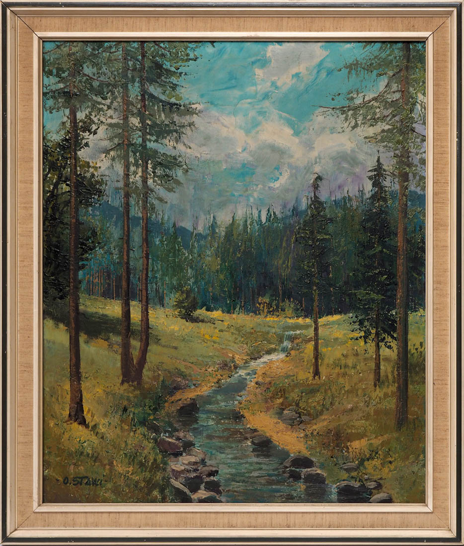 Waldlandschaft in the Mittelgebirge. In the foreground, a stream winds through the meadow