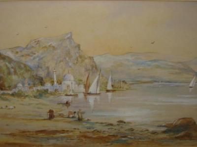 Mediterranean Coastal Scene with Figures in the Foreground, boats and town in the distance