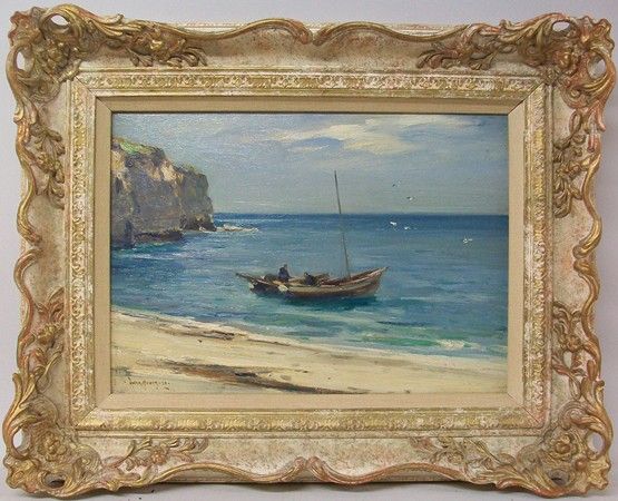 a marine scene with two fishing skiffs in calm seas near shoreline