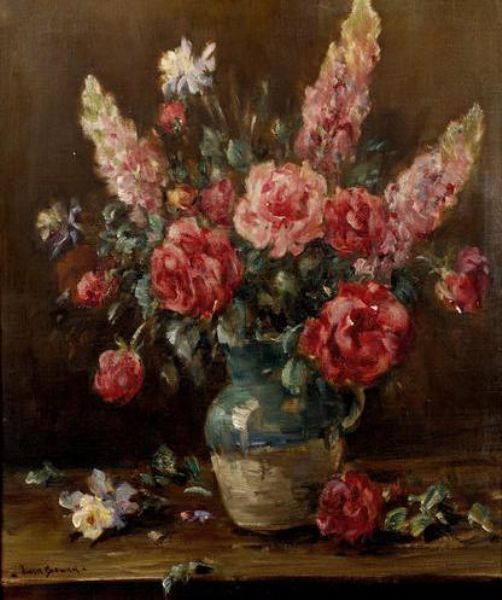 Roses and summer flowers in a green jug on a table