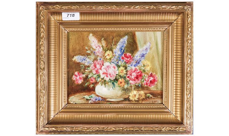 Still life of flowers, in a cream ovoid vase resting on a circular table