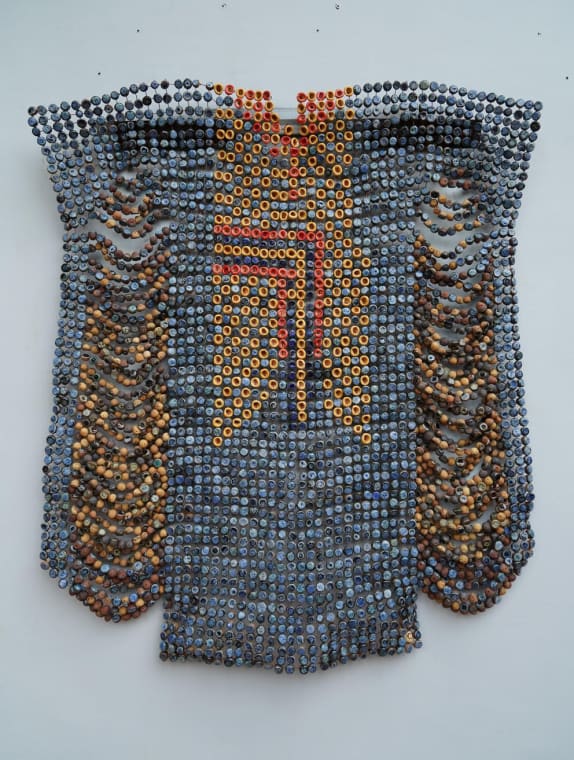 Earthenware and stoneware clays, glazes, recycled glasses and copper wire